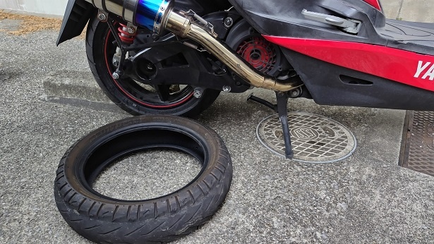 神奈川 横浜市シグナスXの後輪交換:パンク修理もご検討されましたが、タイヤが古く硬化していた為交換を希望されました。