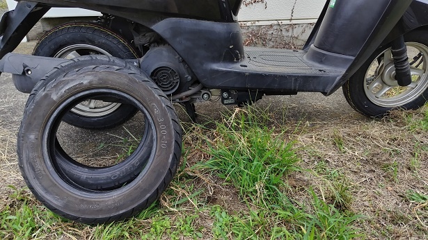 埼玉 川越市ディオのタイヤ交換:出かけ先でのパンクでした、タイヤミゾはまだありましたが古そうなタイヤでしたのでご相談の上交換となりました。
